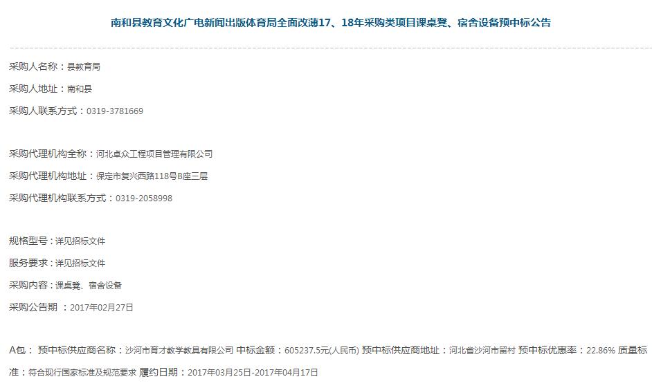 2017年3月20日南和縣教育局課桌凳、雙層床沙河市育才公司中標(biāo)